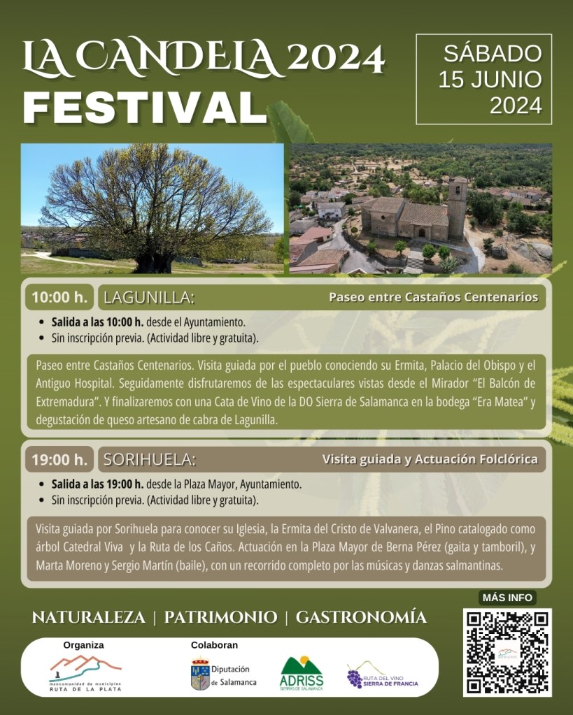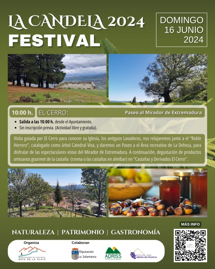 Descubre la Naturaleza y el Patrimonio de los pueblos de la Mancomunidad Ruta de la Plata, con las Actividades Turísticas para el fin de semana del 15 y 16 de junio, dentro de la programación del FESTIVAL LA CANDELA 2024, “Festival del Castaño en Flor en la Ruta de la Plata – Sierras de Béjar” que tendrá lugar del 1 al 22 de junio, en los pueblos de la Mancomunidad Ruta de la Plata.