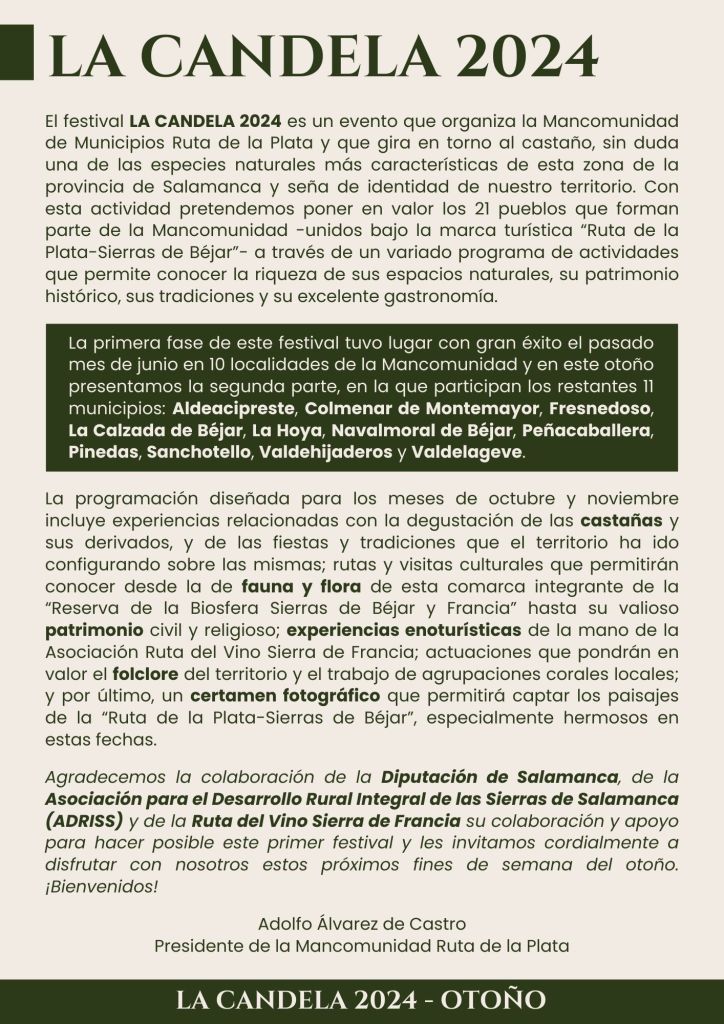 El festival LA CANDELA 2024 es un evento que organiza la Mancomunidad de Municipios Ruta de la Plata y que gira en torno al castaño, sin duda una de las especies naturales más características de esta zona de la provincia de Salamanca y seña de identidad de nuestro territorio. Con esta actividad pretendemos poner en valor los 21 pueblos que forman parte de la Mancomunidad -unidos bajo la marca turística “Ruta de la Plata-Sierras de Béjar”– a través de un variado programa de actividades que permite conocer la riqueza de sus espacios naturales, su patrimonio histórico, sus tradiciones y su excelente gastronomía.