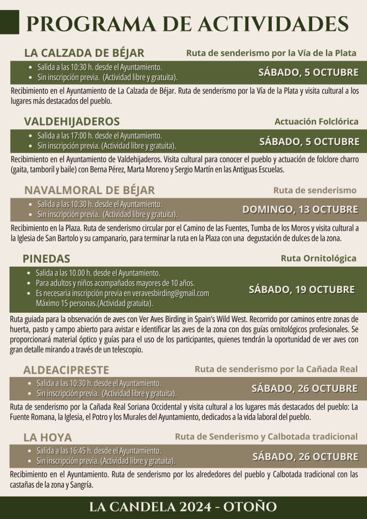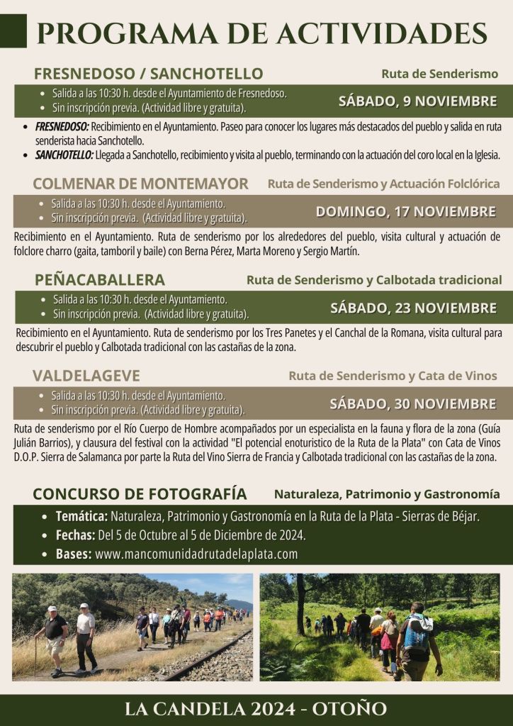 La programación diseñada para los meses de octubre y noviembre incluye experiencias relacionadas con la degustación de las castañas y sus derivados, y de las fiestas y tradiciones que el territorio ha ido configurando sobre las mismas; rutas y visitas culturales que permitirán conocer desde la de fauna y flora de esta comarca integrante de la “Reserva de la Biosfera Sierras de Béjar y Francia” hasta su valioso patrimonio civil y religioso; experiencias enoturísticas de la mano de la Asociación Ruta del Vino Sierra de Francia; actuaciones que pondrán en valor el folclore del territorio y el trabajo de agrupaciones corales locales; y por último, un certamen fotográfico que permitirá captar los paisajes de la “Ruta de la Plata-Sierras de Béjar”, especialmente hermosos en estas fechas..