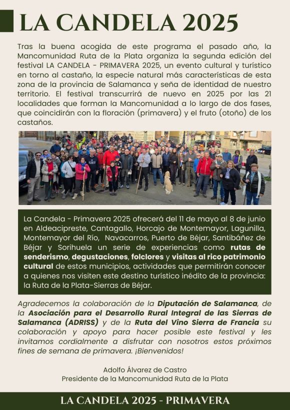 Tras la buena acogida de este programa el pasado año, la Mancomunidad Ruta de la Plata organiza la segunda edición del festival LA CANDELA – PRIMAVERA 2025, un evento cultural y turístico en torno al castaño, la especie natural más características de esta zona de la provincia de Salamanca y seña de identidad de nuestro territorio. El festival transcurrirá de nuevo en 2025 por las 21 localidades que forman la Mancomunidad a lo largo de dos fases, que coincidirán con la floración (primavera) y el fruto (otoño) de los castaños.