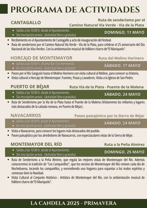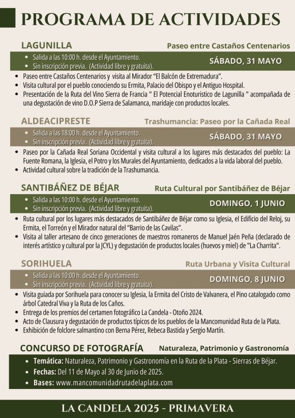 El festival La Candela – Primavera 2025 ofrecerá del 11 de mayo al 8 de junio en Aldeacipreste, Cantagallo, Horcajo de Montemayor, Lagunilla, Montemayor del Río, Navacarros, Puerto de Béjar, Santibáñez de Béjar y Sorihuela un serie de experiencias como rutas de senderismo, degustaciones, folclores y visitas al rico patrimonio cultural de estos municipios, actividades que permitirán conocer a quienes nos visiten este destino turístico inédito de la provincia: la Ruta de la Plata-Sierras de Béjar.