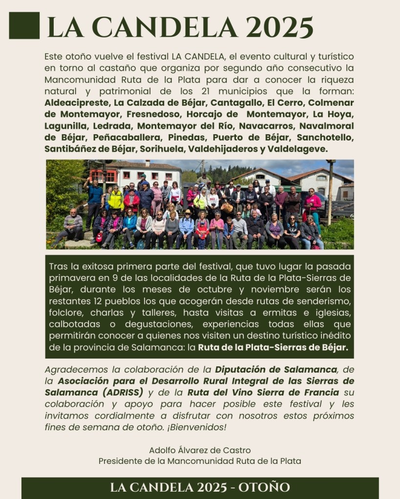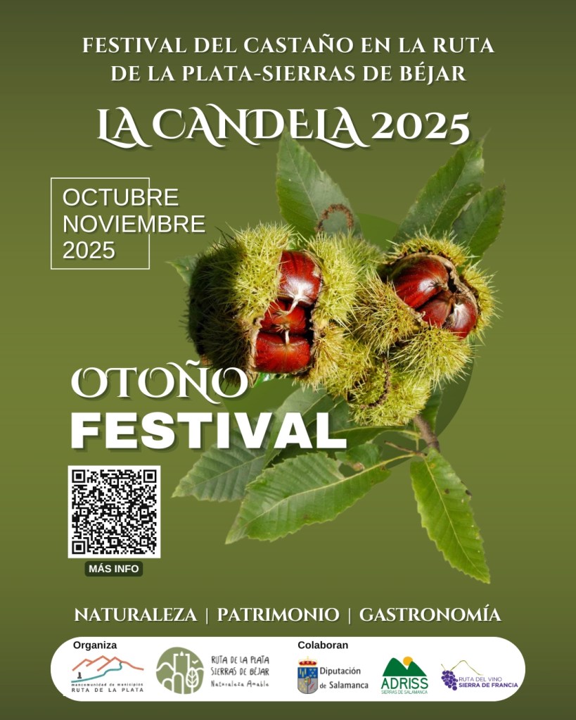 Este otoño vuelve el festival LA CANDELA, el evento cultural y turístico en torno al castaño que organiza por segundo año consecutivo la Mancomunidad Ruta de la Plata para dar a conocer la riqueza natural y patrimonial de los 21 municipios que la forman: Aldeacipreste, La Calzada de Béjar, Cantagallo, El Cerro, Colmenar de Montemayor, Fresnedoso, Horcajo de Montemayor, La Hoya, Lagunilla, Ledrada, Montemayor del Río, Navacarros, Navalmoral de Béjar, Peñacaballera, Pinedas, Puerto de Béjar, Sanchotello, Santibáñez de Béjar, Sorihuela, Valdehijaderos y Valdelageve.