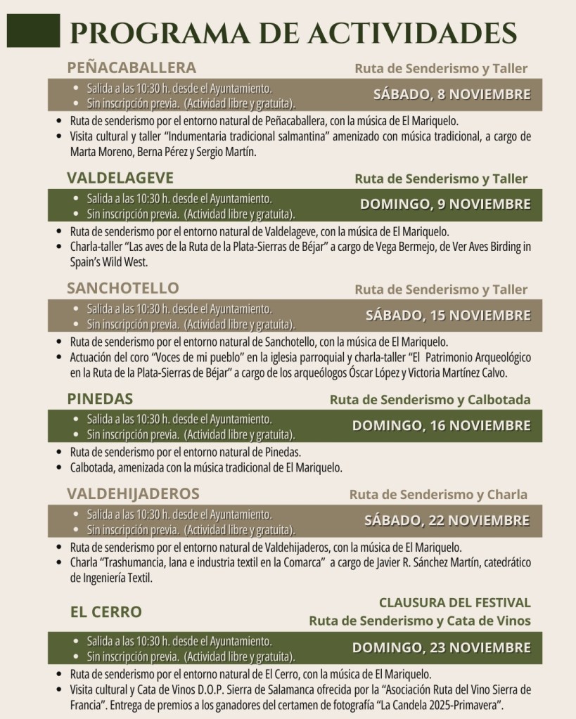 Tras la exitosa primera parte del festival, que tuvo lugar la pasada primavera en 9 de las localidades de la Ruta de la Plata-Sierras de Béjar, durante los meses de octubre y noviembre serán los restantes 12 pueblos los que acogerán desde rutas de senderismo, folclore, charlas y talleres, hasta visitas a ermitas e iglesias, calbotadas o degustaciones, experiencias todas ellas que permitirán conocer a quienes nos visiten un destino turístico inédito de la provincia de Salamanca: la Ruta de la Plata-Sierras de Béjar.